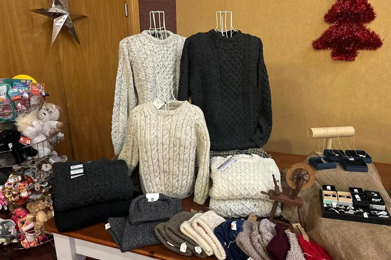 Ceann de bhuaicphointí mhóra an tsiopa ceardaíochta ná an bailiúchán álainn agus éagsúil de gheansaithe Árann. Tá clú agus cáil ar na geansaithe íocónacha seo as a bpatrúin mhionchúramacha, a marthanacht, agus a dteas, agus seasann siad mar fhianaise ar scil iontach agus traidisiún fada na gcnáimhseoirí áitiúla. Tá gach geansaí déanta de láimh go cúramach – rud a chinnteoidh nach mbeidh tú amháin te agus compordach, ach go mbeidh píosa luachmhar d’oidhreacht na hÉireann leat.